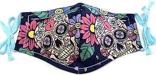 Edle Design Stoffmaske aus Baumwolljersey - Mund Nasenbedeckung mit Filterfach - Mundschutz waschbar - Handgefertigt in Deutschland - Größe M D. Blau Dia de los Muertos